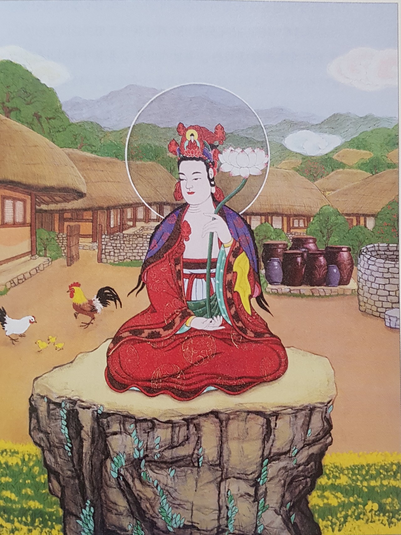 전형적인 청경관음과는 거리가 멀다. 배경도 우리의 농촌풍경이다.