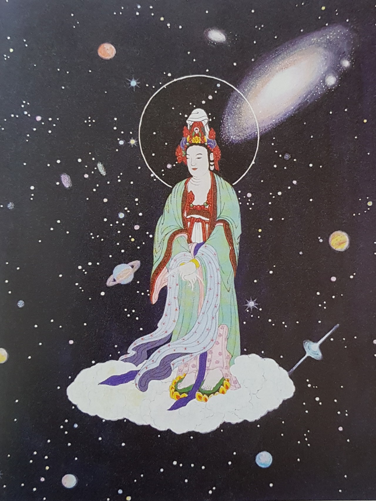 우주를 배경으로 서 있는 일여관세음보살은 우주와 하나다.