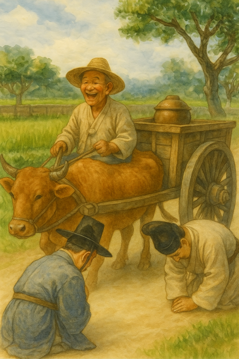 밑천 삼아 소달구지에 올라 배고픔을 달래 줄 집으로 달려가고 있었습니다